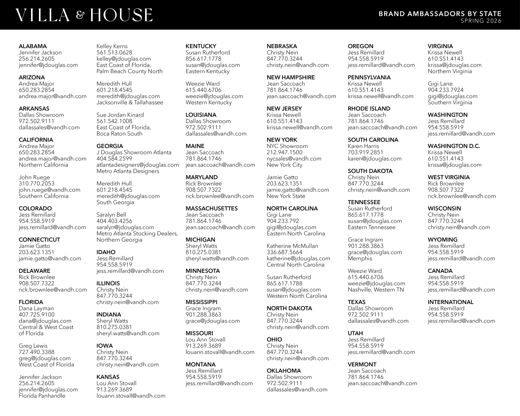Our Sales Representatives are your primary contact for placing orders, addressing product inquiries, and obtaining general information. Sales representatives are exclusively available to trade clients. You can find your designated Sales Representative by using this guide or by contacting us at 201.405.1800 or via email at Orders@VandH.com